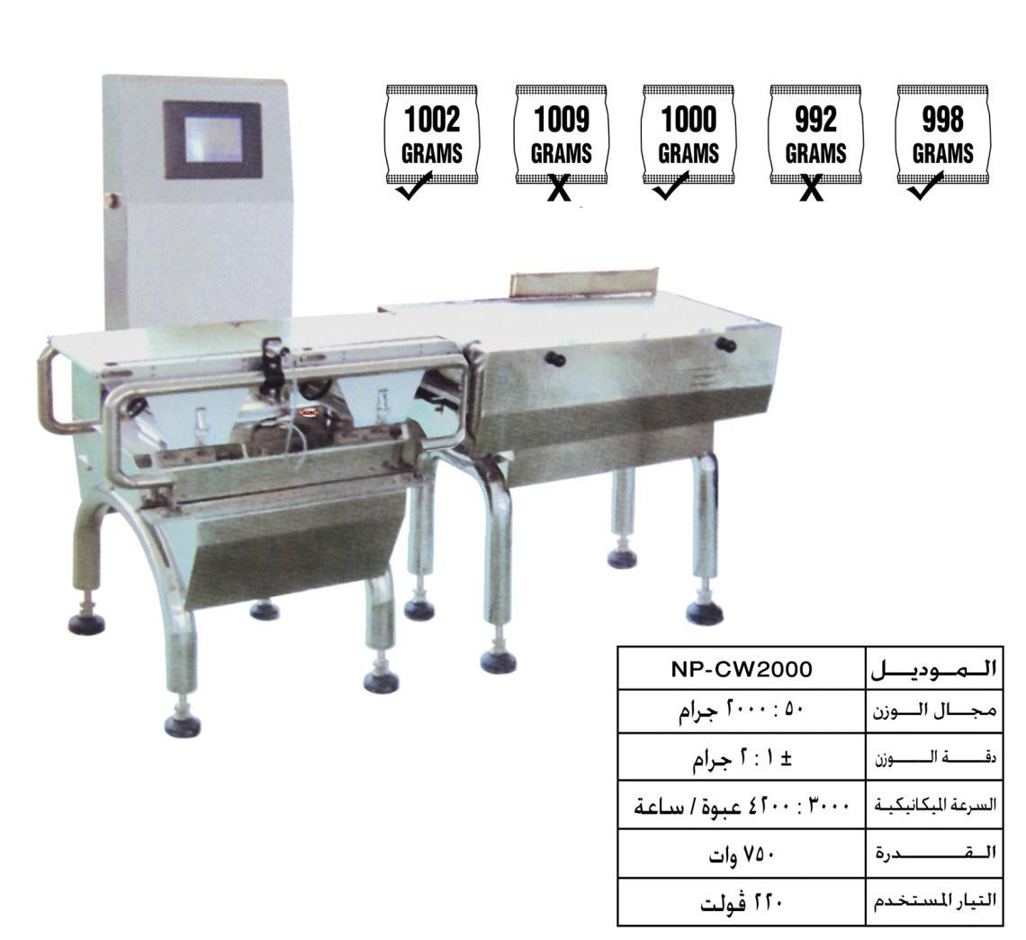 المواصفات : \n \nوحدة تحكم إلكترونى PLC بشاشة تعمل باللمس قابلة للبرمجة من الماركات العالمية – جسم الماكينة الخارجى إستانليس – يمكن ربط الماكينة بخط الإنتاج أو العمل منفردة – إمكانية تخزين بيانات 10 منتجات مختلفة كل منتج بوزنة والدقة المطلوبة – تمر العبوة على سير الماكينة ويتم فحص وزن العبوة وكتابة الوزن على الشاشة – تمر العبوة السليمة بعد الفحص إلى مرحلة تجميع المنتج النهائى – يتم استبعاد العبوة المخالفة إلى مسارأخر لإعاده تعبئتها بالوزن السليم \n \n– يتم توفير مصدر الهواء المناسب لتشغيل الماكينة بواسطة العميل