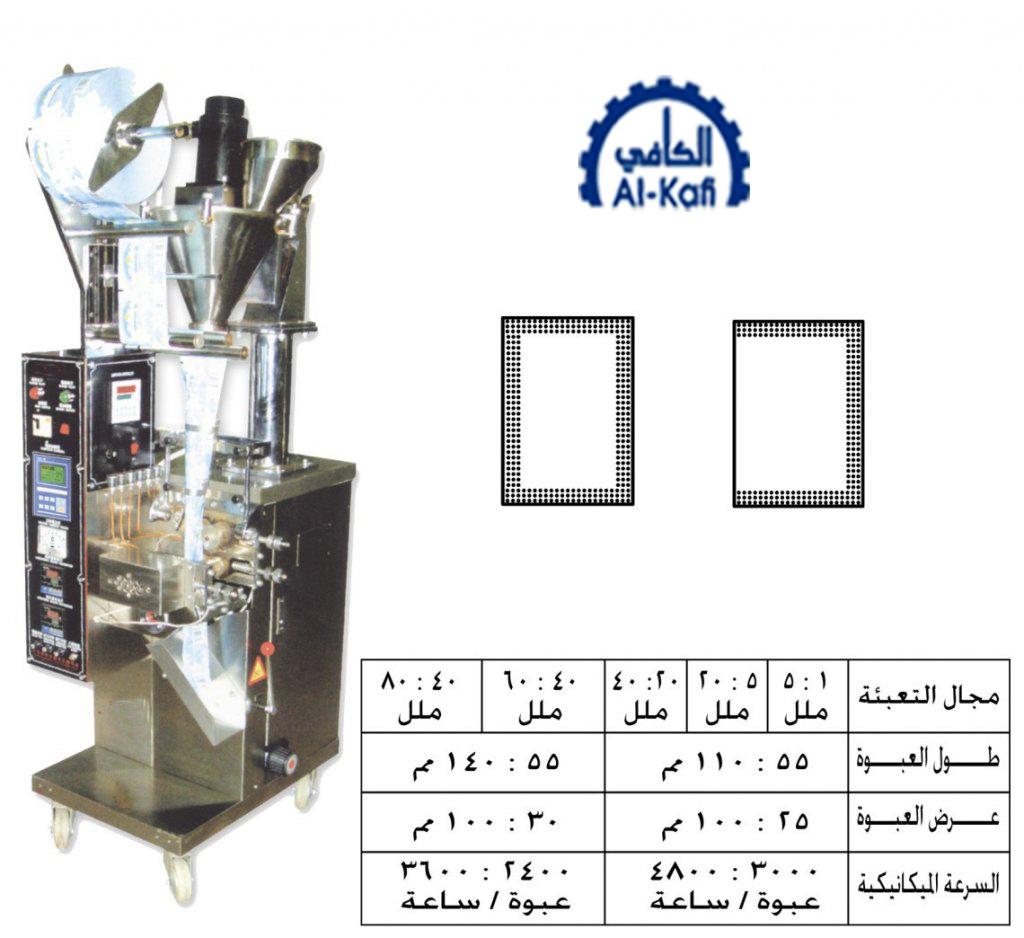 المواصفات :\nوحدة تحكم إلكترونى بشاشة قابلة للبرمجة – الجسم الخارجى للماكينة إستانليس – ضبط الحرارة إلكترونياً – ضبط طول الكيس إلكترونياً من الشاشة – إختيار كمية إنتاج أكياس محددة من الشاشة – فوتوسيل – طابعة اكواد وتواريخ بالحبر الجاف – الأجزاء الملامسة للمنتج إستانليس – عداد منتج – فك لحام روتارى – سهولة تغيير اللحام ثلاثى أو رباعى بدون تغيير الفك – التحكم فى أوجر التعبئة بواسطة إستيبر موتور- تسلم الماكينة على عرض رول واحد وأوجر تعبئة واحد\nإضافات بالطلب:\nسلسلة عبوات – إيزى أوبن – داست كوليكتور – سايز جروب لعرض رول إضافى – سايز جروب لحجم تعبئة إضافى
